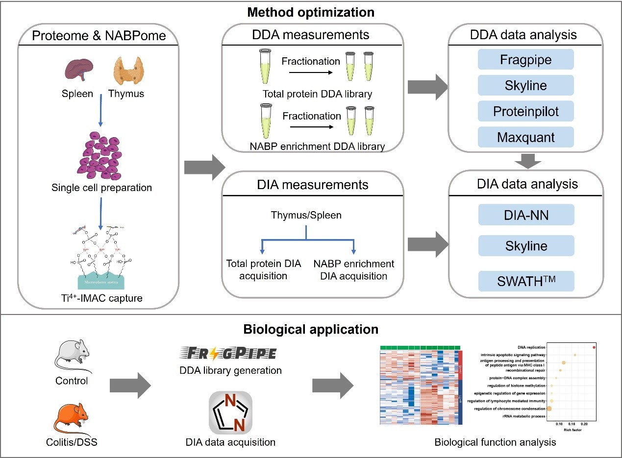 核酸结合蛋白是维持生命活动的核心调控因子,通过与核酸紧密结合参与 DNA 复制、转录调节、RNA 加工等关键生物学过程,其表达失衡、与核酸互作的改变常与炎症、癌症、衰老等密切相关。然而,由于这类蛋白通常丰度偏低且与核酸的结合呈现动态变化,其在复杂组织样本中的深度解析长期受到现有实验技术的限制。肖华教授团队长期聚焦核酸结合蛋白质组的重要生物学功能研究(Mol. Cell. Proteomics 2023, 22:100611;J. Proteome Res. 2022, 21:220-231;ACS Appl. Mater. Interfaces 2018, 21:17756-17770),在前期工作基础上,针对传统蛋白质组学难以深入捕获低丰度核酸结合蛋白的瓶颈,创新性地将亲和富集策略与DIA 蛋白质组学技术相结合,构建了全新的 NABP-DIA 策略。研究团队以炎症性肠病小鼠模型为研究对象,对其脾脏和胸腺中的核酸结合蛋白质组进行了系统鉴定与功能解析,并进一步结合组蛋白翻译后修饰质谱、细胞与动物模型验证了关键表观遗传调控因子在炎症进程中的功能,其总体研究流程如图1所示。