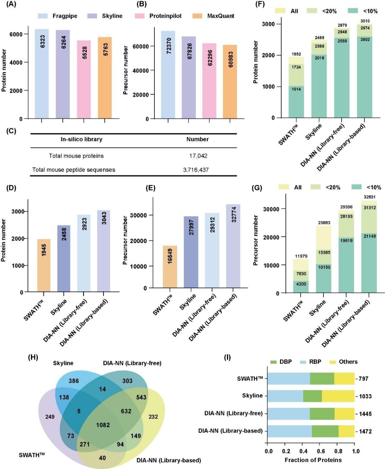 研究人员利用固定化钛离子亲和色谱技术结合高分辨率 DIA 蛋白质组学技术,系统绘制了胸腺与脾脏来源核酸结合蛋白的深度图谱。在方法学性能评估阶段,首先比较了不同软件(Fragpipe、Skyline、Proteinpilot、MaxQuant)生成的谱图库质量,其中,Fragpipe鉴定到了最多的蛋白数量(包含6323个蛋白)。接下来,研究人员比较了不同软件(DIA-NN、OpenSWATH、Skyline)处理DIA数据的能力,DIA-NN使用Fragpipe生成的谱图库流程获得了最高的蛋白数量(2984个蛋白),相关结果如图2所示。